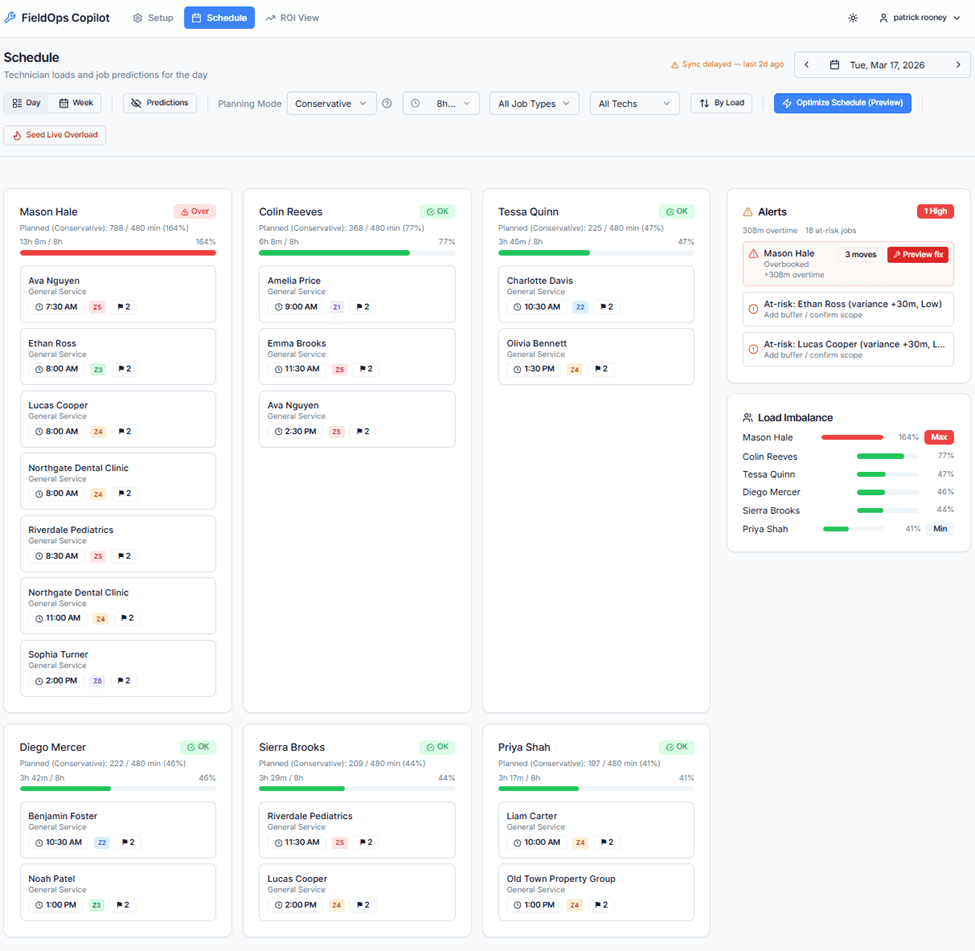 Includes drive time, technician load, and constraints